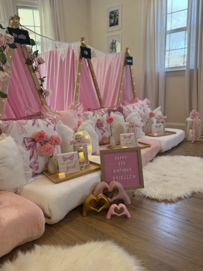 The ultimate girly dream, this theme features soft pink teepee tents, vintage-inspired charm, and elegant glam décor—perfect for a chic and unforgettable slumber party for girls.