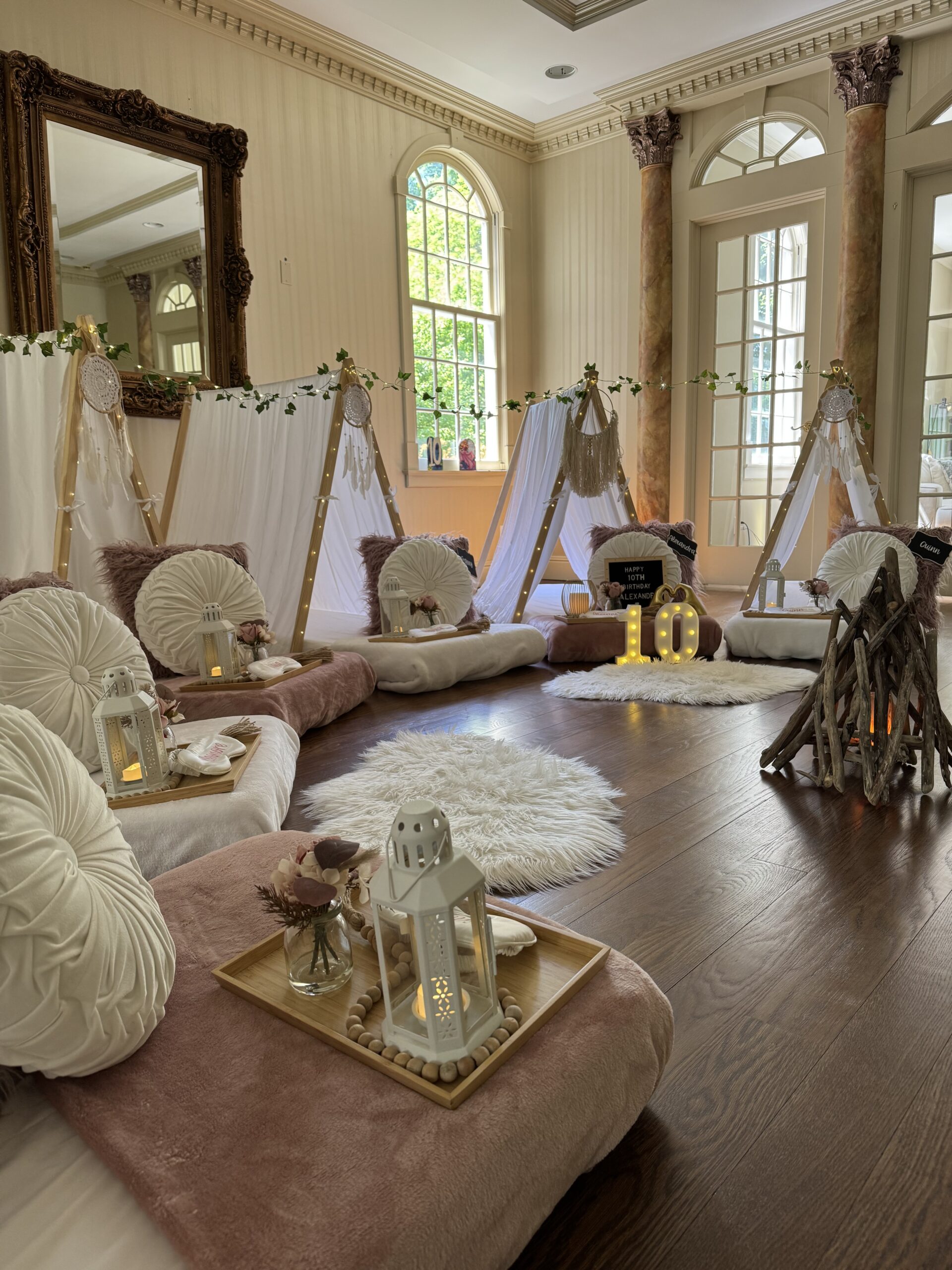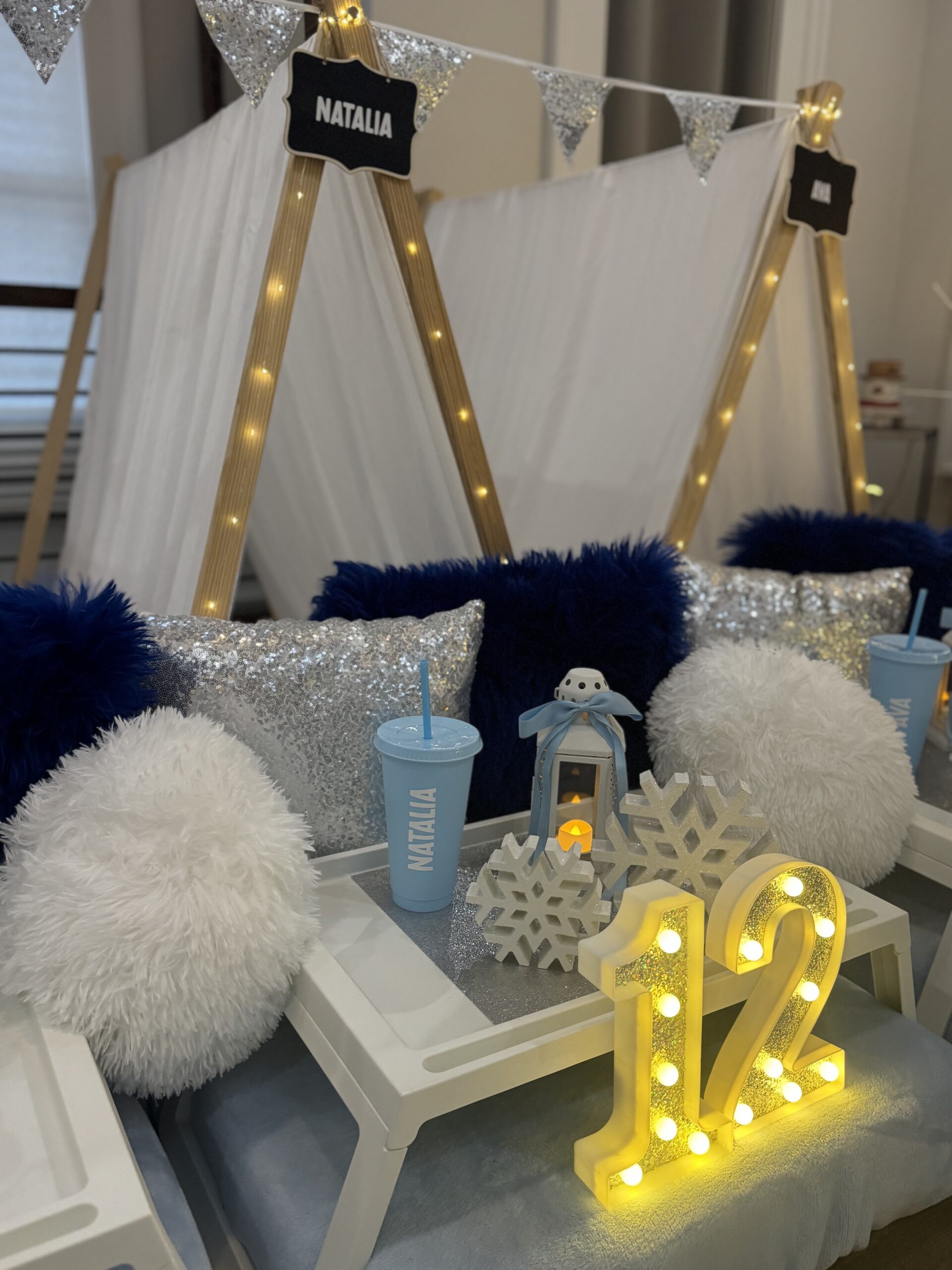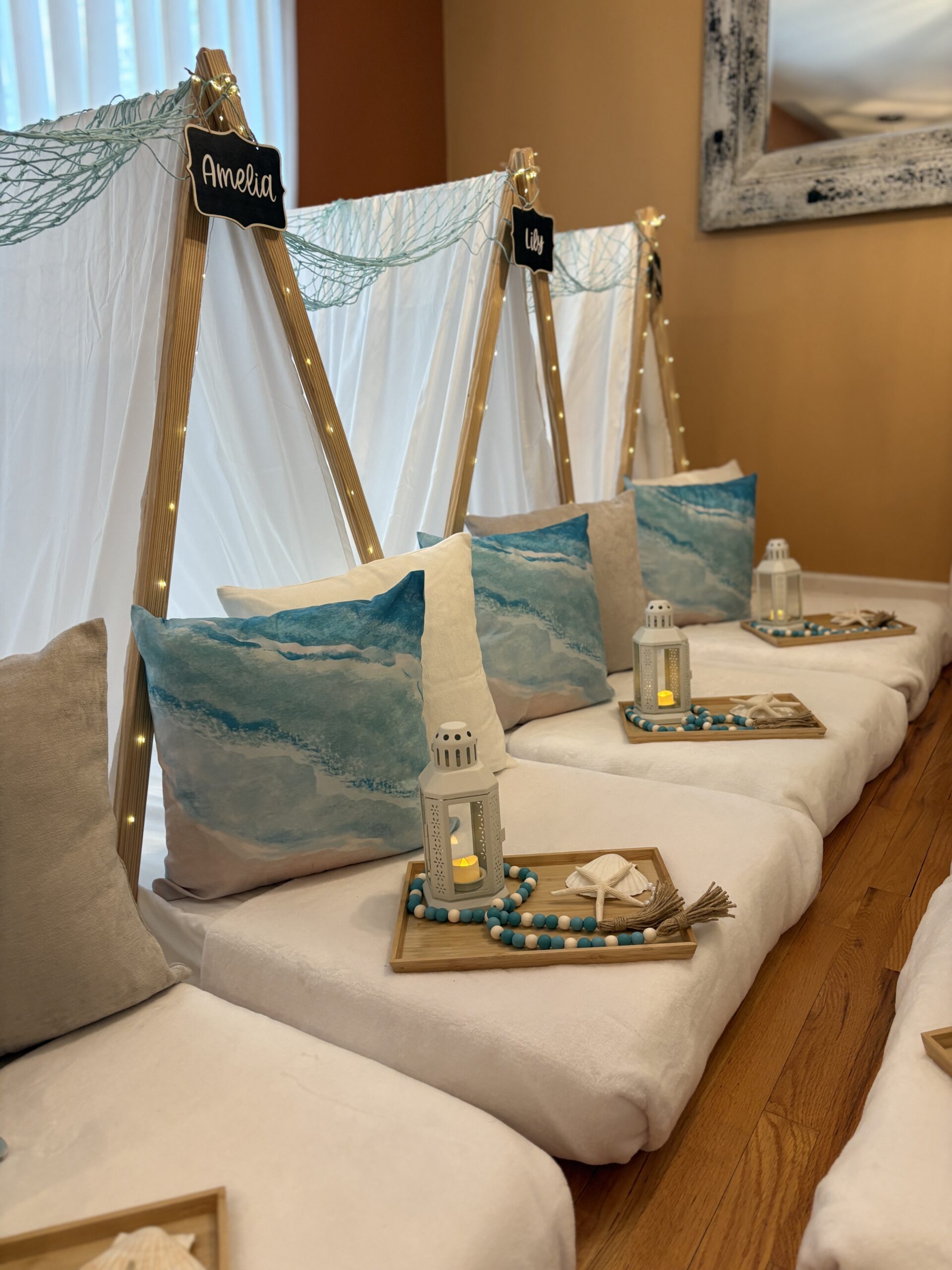 The Blue Coquette Slumber Party features elegant teepees, soft blue tones, delicate florals, and cozy luxe décor for a chic and dreamy sleepover experience.