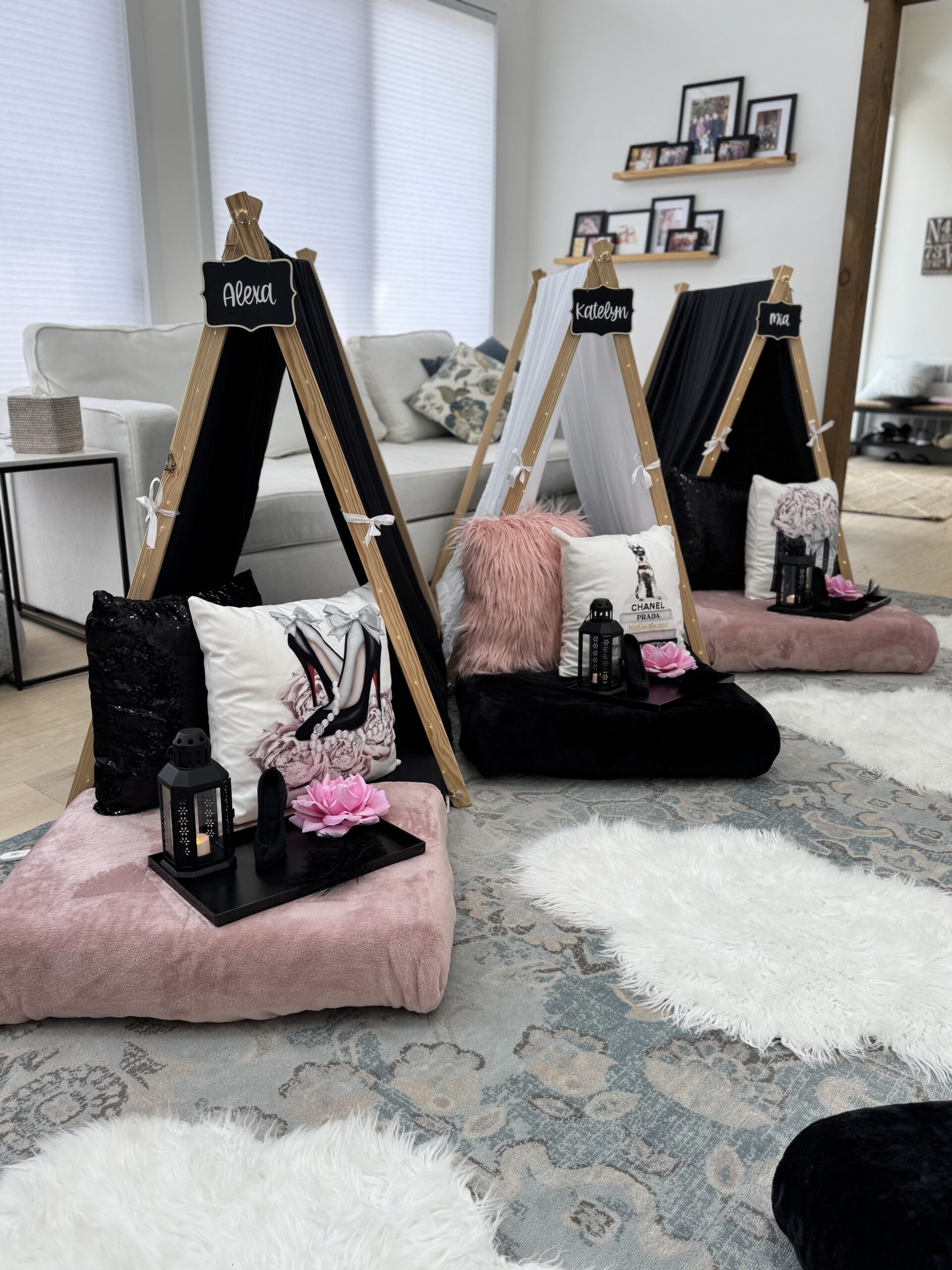 Elegant yet playful, this theme blends chic glam with a dreamy edge. Featuring blush-and-black décor, plush velvet pillows, and delicate lace garlands, it creates a stylish, coquette-inspired atmosphere. Perfect for fashionistas and trendsetters looking for a sleepover with a touch of mystery and charm.