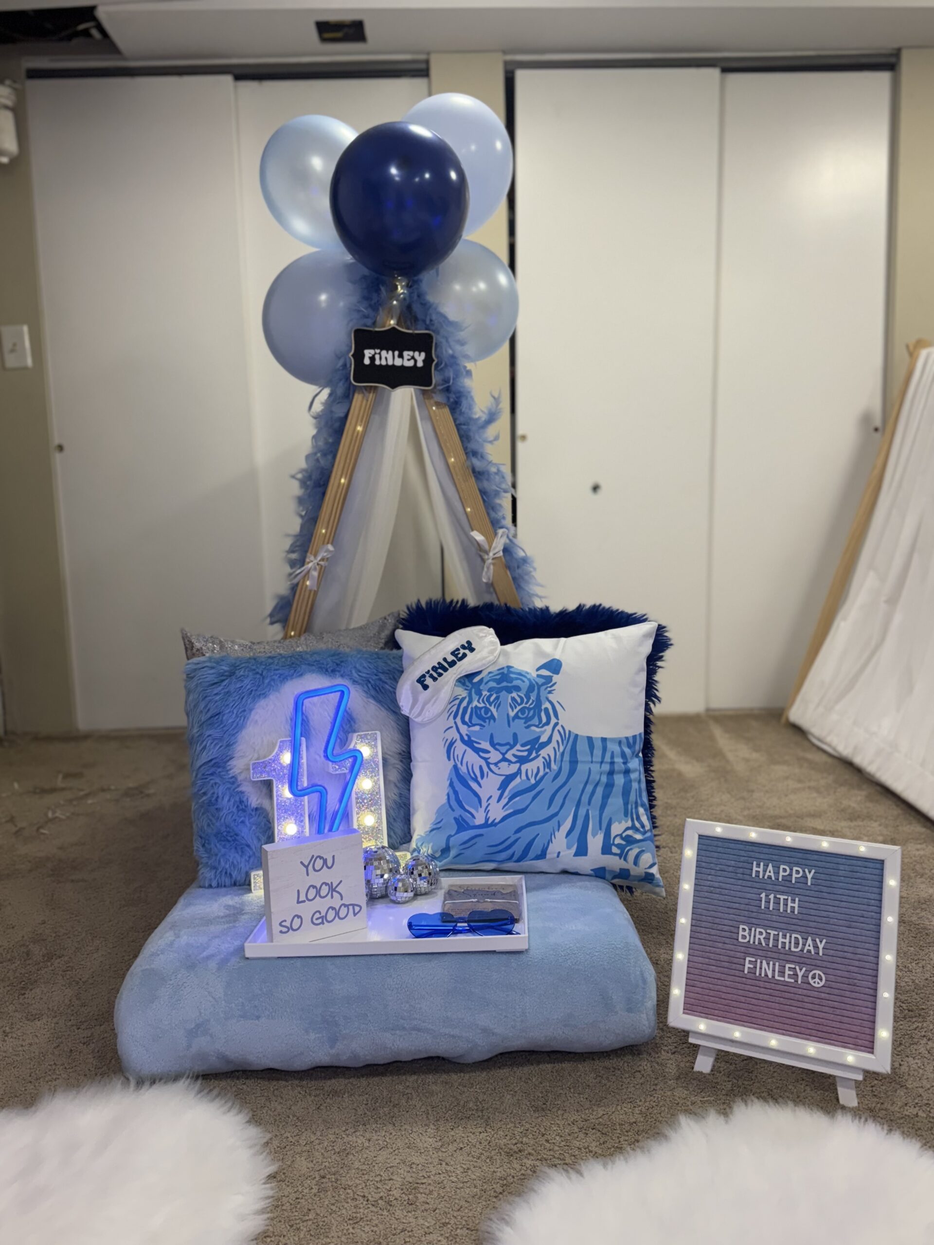 Modern and cool, Preppy Posh Blue is a trendy take on the classic sleepover. This theme mixes bold blue tones with cozy tent styling — ideal for preppy sleepover tents and slumber party themes for tweens with style.