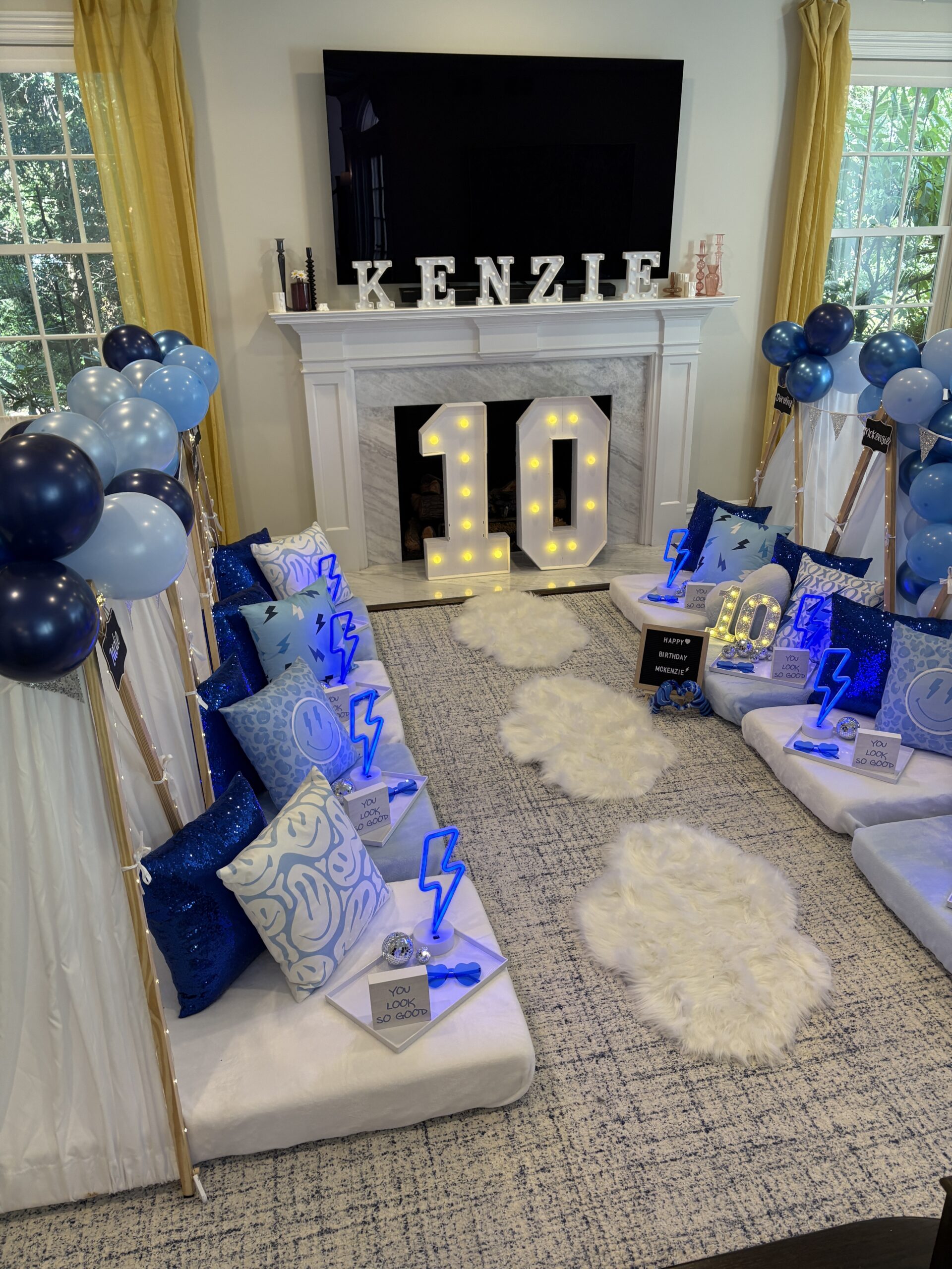Modern and cool, Preppy Posh Blue is a trendy take on the classic sleepover. This theme mixes bold blue tones with cozy tent styling — ideal for preppy sleepover tents and slumber party themes for tweens with style.