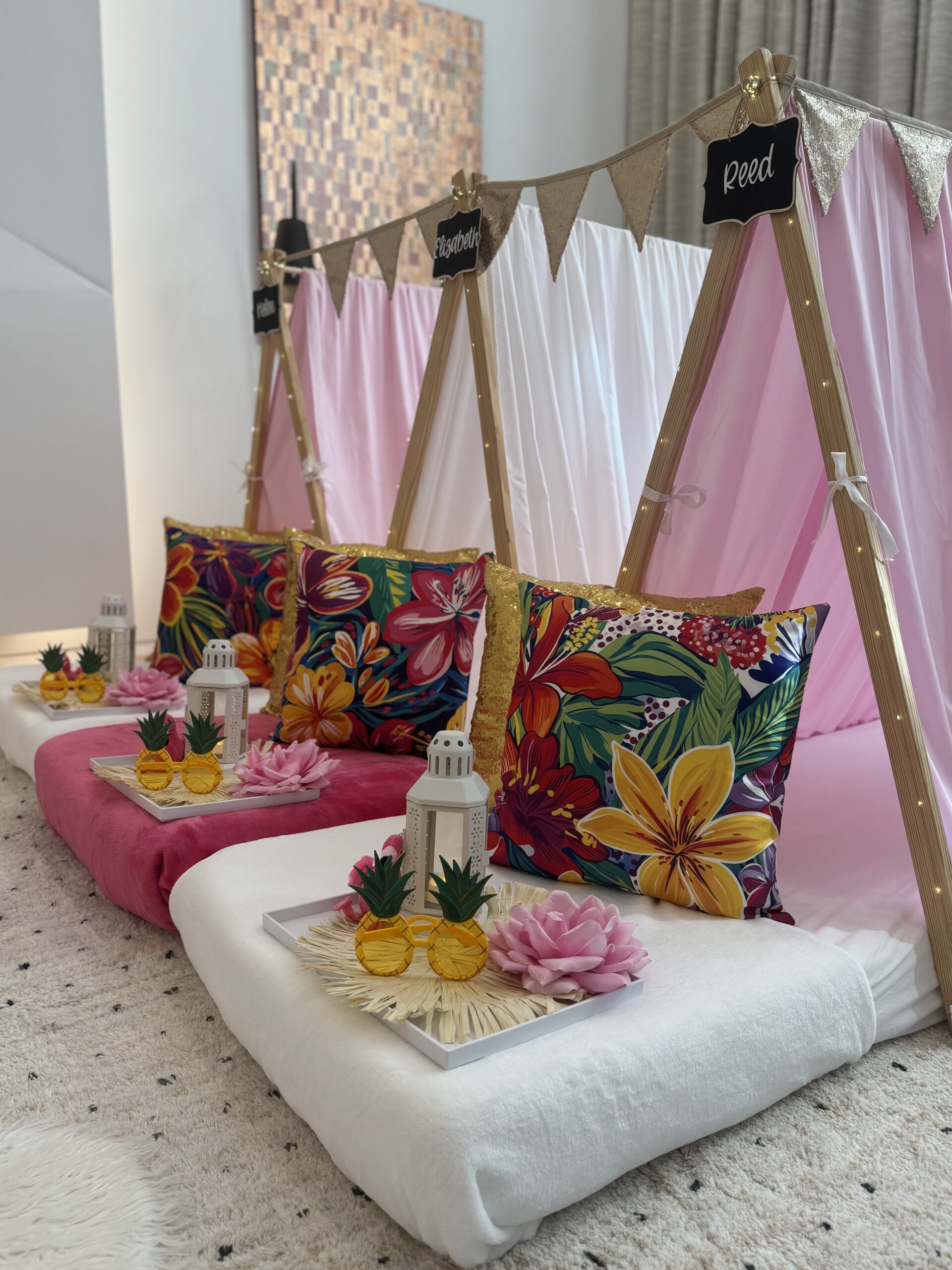 Playful and pretty, the Boho – Pink setup adds a fun twist to traditional girl birthday party themes. Featuring blush tones, cozy tents, and boho-inspired decor, this theme is a go-to for stylish yet cozy tent sleepover parties.