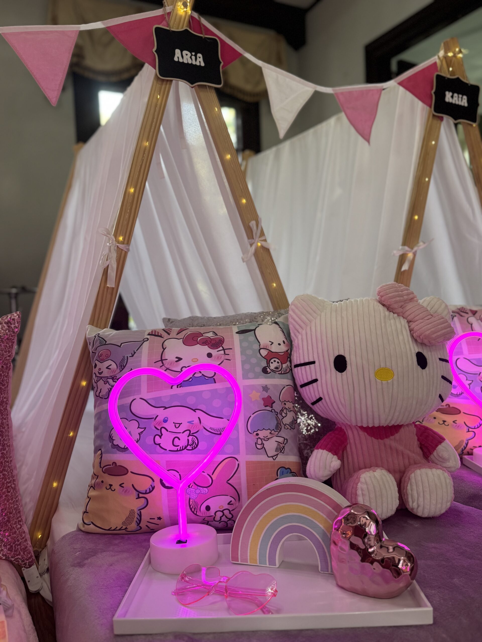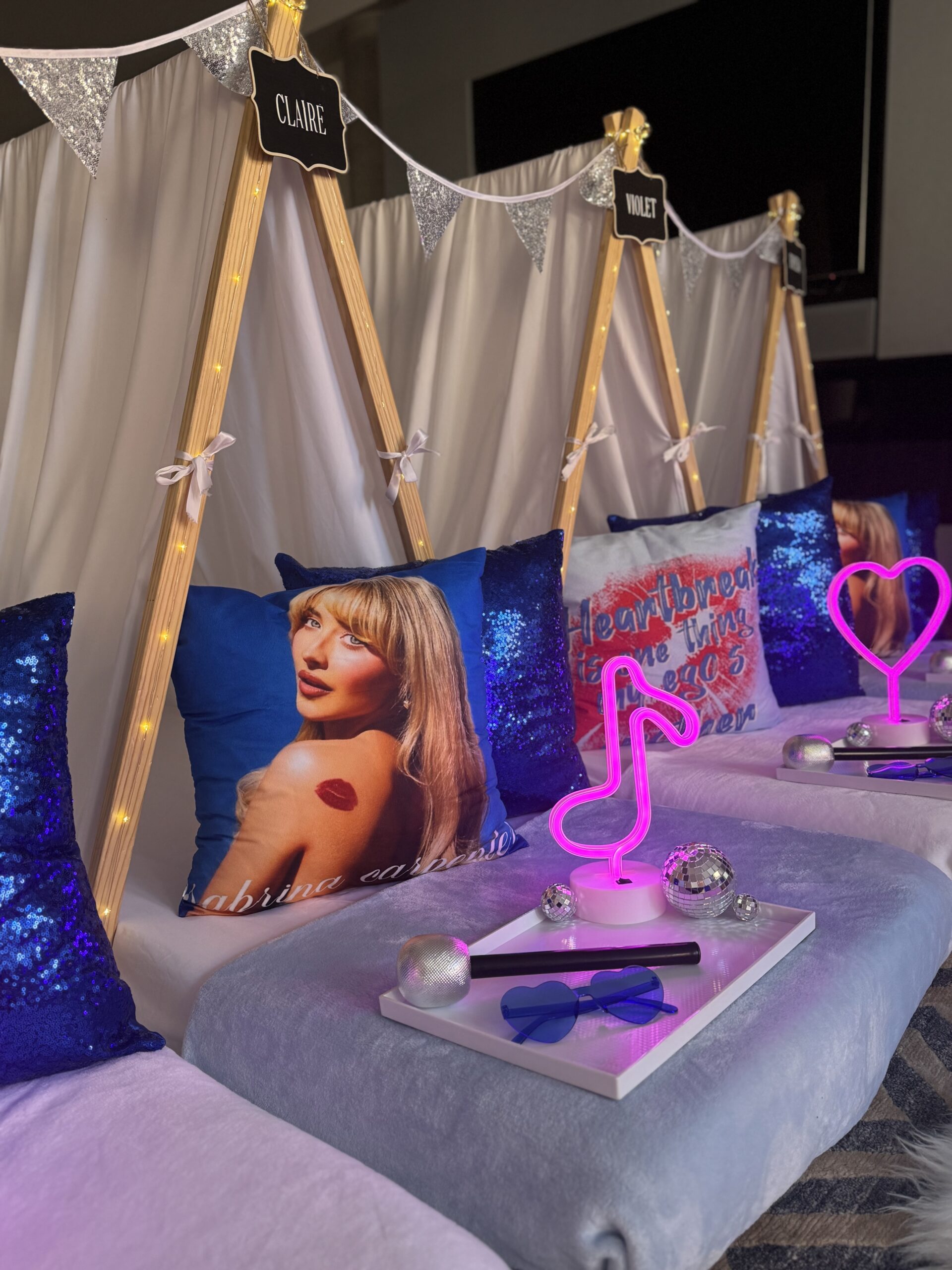 Calling all Swifties! Celebrate each era of Taylor Swift with themed tents, sparkles, and iconic touches. This fan-favorite sleepover party theme is perfect for group singalongs, friendship bracelets, and making magical memories with your besties.