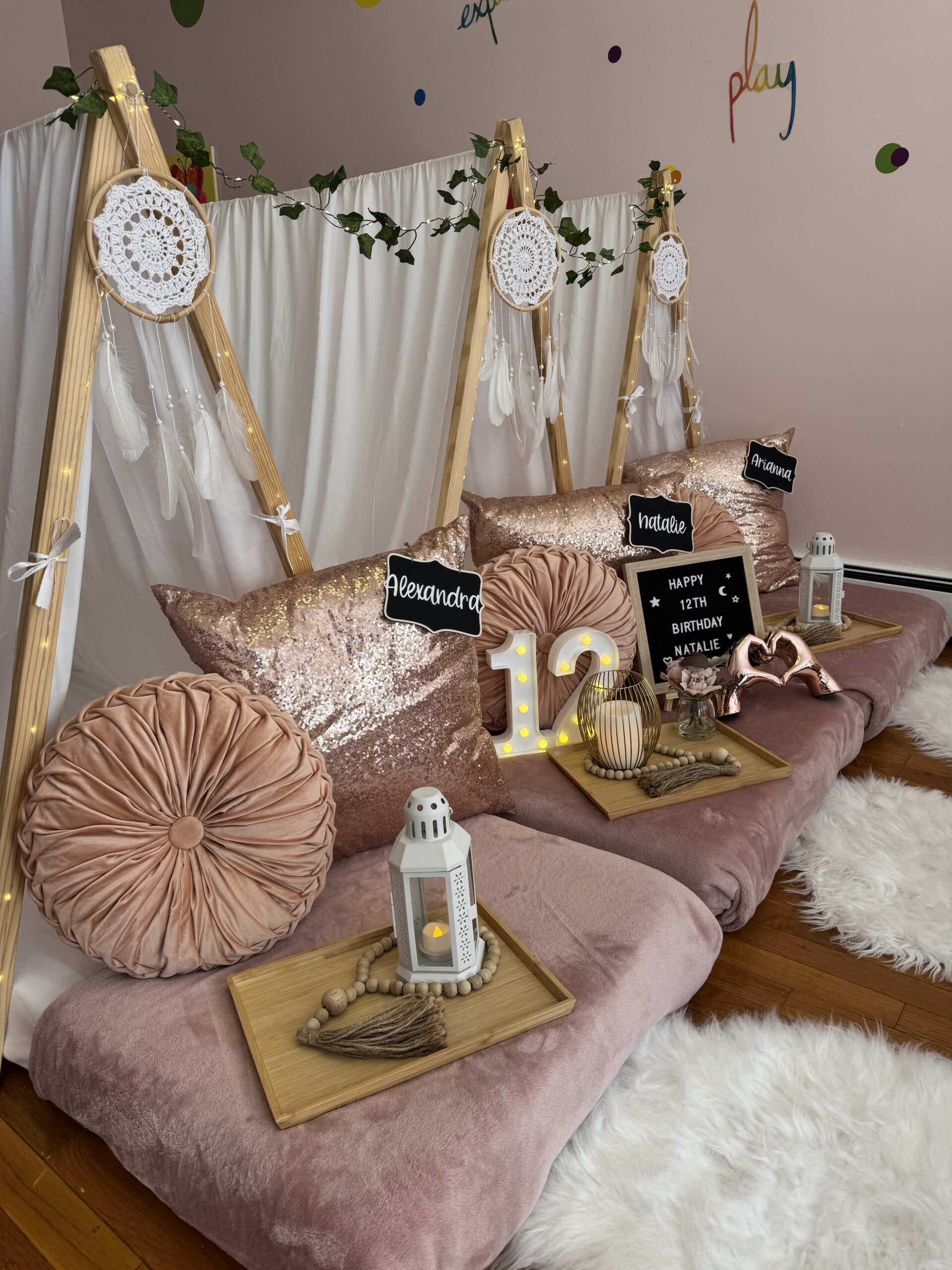 Dreamy and elegant, our Boho – Rose Gold theme is perfect for creating a warm, whimsical atmosphere. With soft lighting, neutral tones, and shimmering rose gold accents, it’s an ideal choice for sleepover party decoration ideas and relaxed slumber party themes with a touch of class.